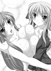 ──ニュルン、だぷだぷ♥ くちゅ♥ ニュル、だぷぷぷン! 下から迫り上がってくる雅の弾力乳と、上からのしかかってくるあかりの柔らか乳。 その狭間で揉みくちゃにされる拓弥のペニスは、強烈な肉悦の渦に巻き込まれ続ける。 あかりの天才的な勘のよさと、雅の大人顔負けの聡明さによって、ダブルパイズリが生み出す快感量が加速度的に増大していく。 「ああ、も、もうイクっ! イッちゃうよぉおぉ!」 立て続けに変則的な責められ方をされた肉悦の蓄積もあり、拓弥は瞬く間に限界を叫んでいた。 そして、これまで挟まれっぱなしだった少年の腰が、カクカクと二人の肉の狭間に向けて突進する。肉先が抵抗感の違う柔肉の狭間を突き進んでいると、同じように硬い二つの突起に突き当たった。 二人の乳首だ。 柔肉の海の中に見つけたそのシコリを、拓弥は己の肉先で本能的に突きまくる。 「ああン♥ 拓弥クンのすごいよぉ♥」 「そんなにさられたら、わたくしも胸だけでイッてしまいますわぁ♥」 二人は恍惚した表情でこちらを見上げてきた。 互いの腰に回した腕に力を込めて、さらに互いを引きつけあって。 そのため肉棒の周りでは、豊潤な愉悦がさらに密度を増して弾け続ける。